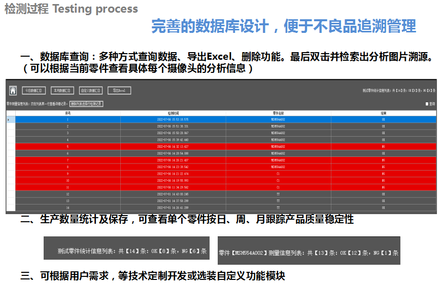 3、檢測(cè)零件統(tǒng)計(jì)數(shù)據(jù)可查詢、導(dǎo)出Excel;