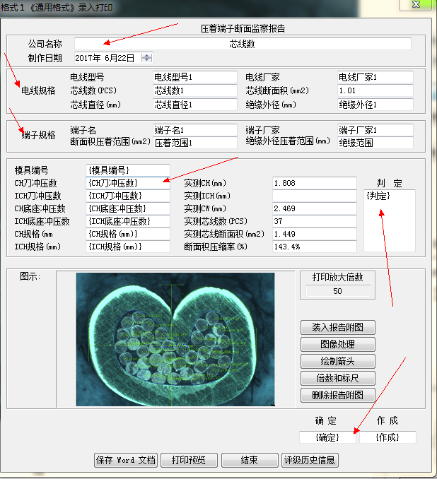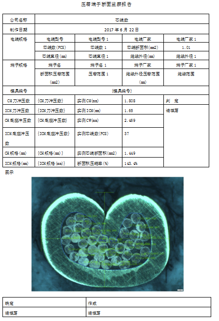 本軟件可測量端子芯線數;壓接高度;壓接寬度;壓接角度;支承高度;尖端間距;毛刺高度;毛刺寬度;基體厚度;芯線斷面積;斷面積壓縮比率。