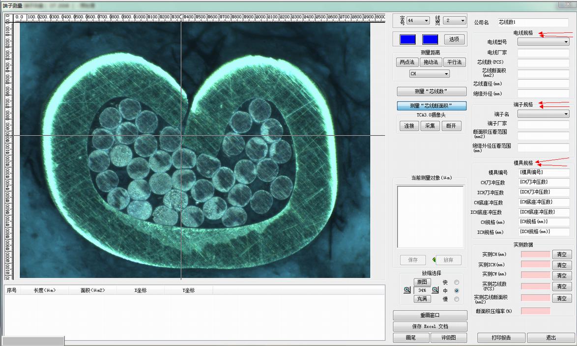 1、端子斷面測(cè)量分析功能:本軟件可測(cè)量端子芯線數(shù);壓接高度;壓接寬度;壓接角度;支承高度;尖端間距;毛刺高度;毛刺寬度;基體厚度;芯線斷面積;斷面積壓縮比率。